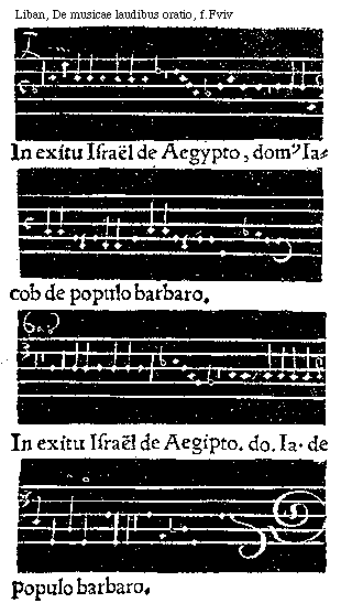 [f.Fviv] [Liban, De musicae laudibus oratio, f.Fviv; text: Tenor, In exitu Israel de Aegypto, domus Iacob de populo barbaro, Bassus] [LIBDEM 09GF]