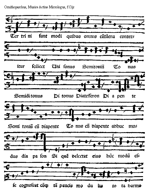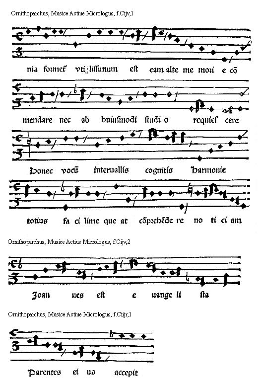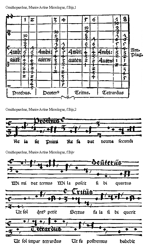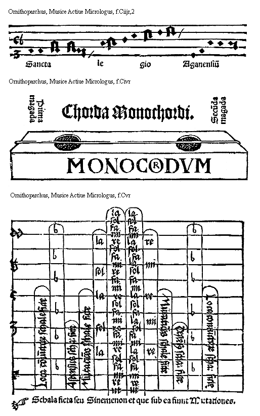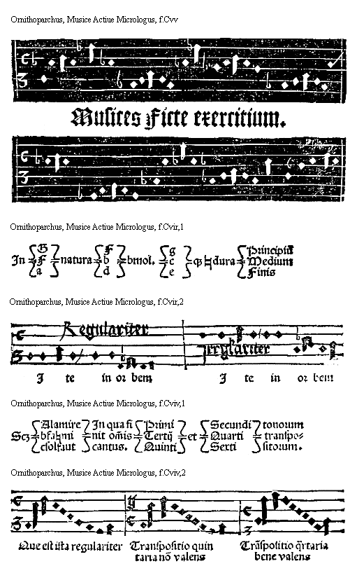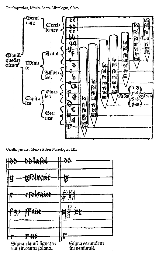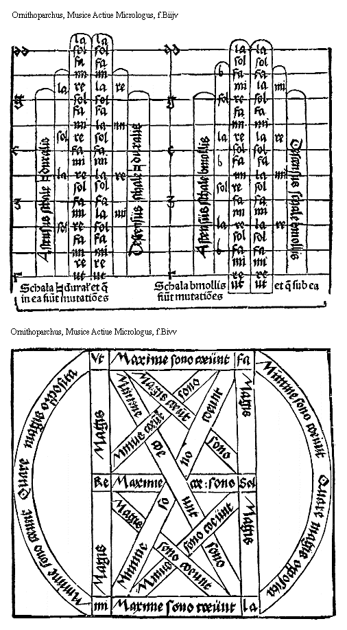 [Ornithoparchus, f.Cviv,1; text: Scilicet, Alamire, [rob]fa[sqb]mi, csolfaut, In qua finit omnis cantus. Primi, Tertij, Quinti, et, Secundi, Quarti, Sexti, tonorum transpositorum.] [ORNMUS1 08GF]