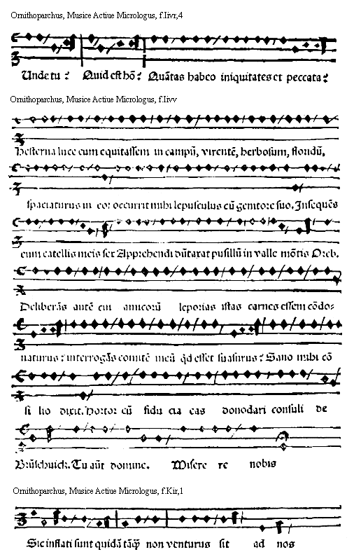 [Ornithoparchus, f.Iivv; text: Hesterna luce cum equitassem in campum, virentem, herbosum, floridum, spaciaturus in eo: occurrit mihi lepusculus cum genitore suo. Insequens eum catellis meis sex Apprehendi dumtaxat pusillum in valle montis Oreb. Deliberans autem cui amicorum leporias istas carnes essem condonaturus: interrogans comitem meum quod esset suasurus? Sano mihi consilio dixit. Hortor cum fiducia eas donodari consuli de Brunschuick. Tu autem domine. Miserere nobis] [ORNMUS3 02GF]