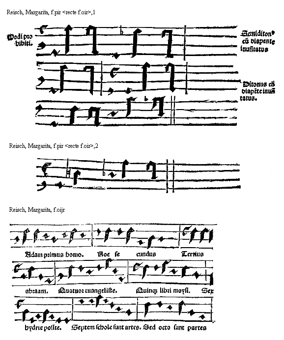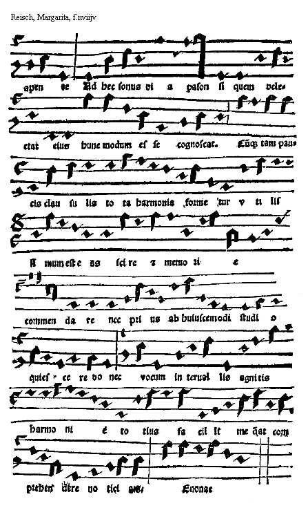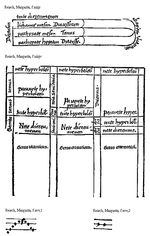[Reisch, Margarita, f.niiijr; text: Diapason, diapente, trite diezeumenon, lichanos meson Diatesseron, parhypate meson Tonus, parhypate hypaton] [REIMAR 02GF]