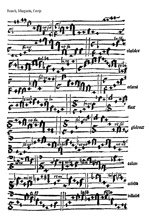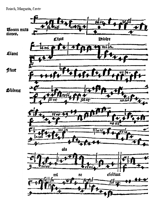 [Reisch, Margarita, f.nviv; text: Vocum mutationes. Elami, Ffaut, Gsolreut, Cfaut, Dsolre, alamire, csolfaut, ut re mi fa sol la] [REIMAR 03GF]
