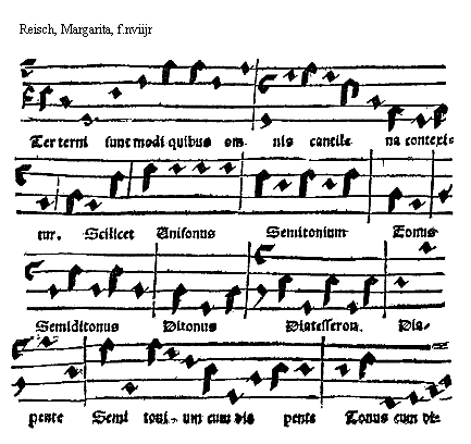 [Reisch, Margarita, f.nviijr; text: Ter terni sunt modi quibus omnis cantilena contexitur. Scilicet Vnisonus Semitonium Tonus Semiditonus Ditonus Diatesseron Diapente Semitonium cum diapente Tonus cum diapente] [REIMAR 05GF]