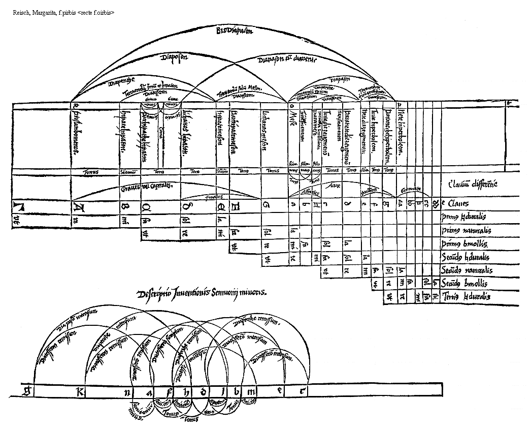 [f.pirbis <recte f.oirbis>] [Reisch, Margarita, f.pirbis <recte f.oirbis>; text: BisDiapason, Diapason cum diapente, Diapenthe, Tetracordum primum et hipaton, Diatesseron, Tetracordum secundum Meson, Semitonium maius, minus, coma, tertium, quartum excellentium, proslambomenos. hipatehipaton. parhipathehipaton, lichanos hipaton. hipatemeson, parhipatemeson, lichanosmeson, Mese, Tritesinemenon, paramese, paranete sinemenon, Tritediezeugmenon, Netesinemenon, paranetediezeugmenon, Netediezeugmenon. Tritehiperboleon. Paranethehiperboleon, Netehiperboleon. Clauium differentie, Claues, primus [sqb] duralis, naturalis, bmollis, Secundus, Tertius, vt, re, mi, fa sol, la, Graues vel Capitales, finales, Affinales, Acute, excellentes, Germinate, [Gamma], A, B, [sqb], C, D, E, F, G, a, b, [sqb][sqb], c, d, e, f, g, aa, bb, cc, dd, e, Descriptio Inuentionis Semitonij minoris. Diapason intensum, Diatesseron remissum, diapenthe, sumptum, semitonium minus, tonus, apotome, g, k, n, a, f, h, d, l, b, m, e, c] [REIMAR 08GF]