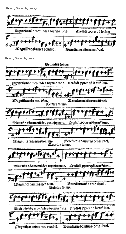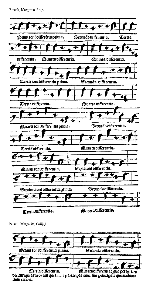 [Reisch, Margarita, f.oijv; text: Primi toni differentia prima. Secunda, Tertia, Quarta, Quinta, Tertij, Quarti, Quinti, Sexti, Septimi] [REIMAR 09GF]