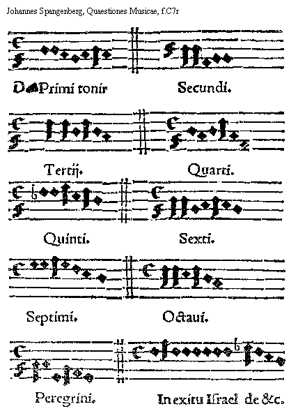 [Johannes Spangenberg, Quaestiones Musicae, f.C7r; text: Primi toni. Secundi. Tertij. Quarti. Quinti. Sexti. Septimi. Octaui. Peregrini. In exitu Israel de et caetera.] [SPANQUA 08GF]