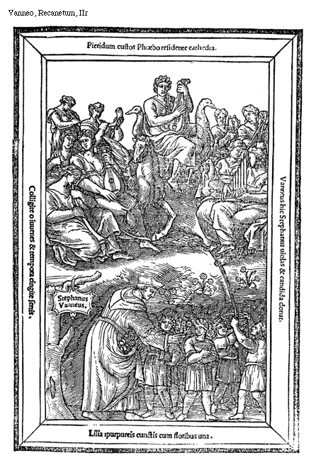 [IIr] [Vanneo, Recanetum, IIr; text: Pieridum custos Phoebo residente cathedra. Vanneus hic Stephanus uiolas et candida donat. Lilia: purpureis cunctis cum floribus una. Colligite o iuuenes et tempora cingite sertis.] [VANREM 01GF]
