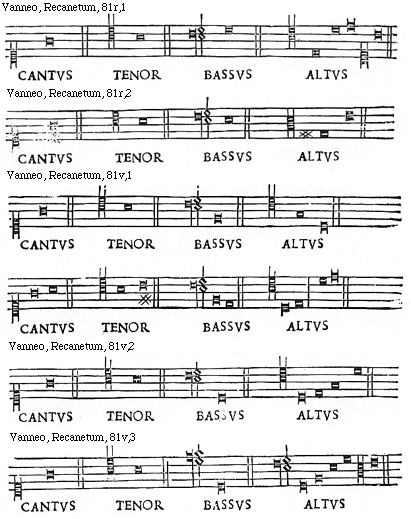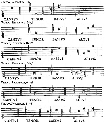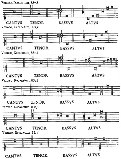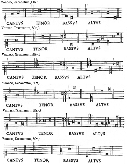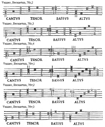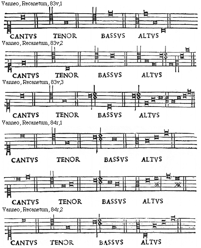 [Vanneo, Recanetum, 88v,3; text: CANTVS, TENOR, BASSVS, ALTVS] [VANREM 58GF]