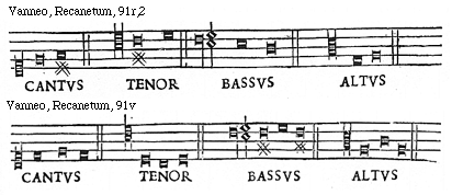 [Vanneo, Recanetum, 91v; text: CANTVS, TENOR, BASSVS, ALTVS] [VANREM 60GF]