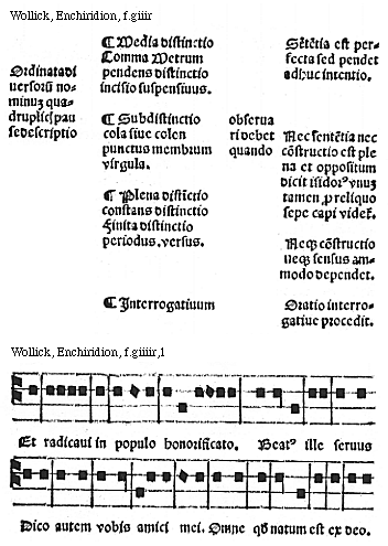 [f.giiir] [Wollick, Enchiridion, f.giiir; text: Ordinata diuersorum nominum quadruplici pause descriptio, Media distinctio, Comma Metrum pendens distinctio incisio suspensiuus. Sententia est perfecta sed pendet adhuc intentio. Subdistinctio cola siue colon punctus membrum virgula. obseruari debet quando, Nec sententia nec constructio est plena et oppositum dicit Isidorus vnum tamen pro reliquo sepe capi videtur. Plena distinctio constans distinctio Finita distinctio periodus. versus. Neque constructio neque sensus ammodo dependet. Interrogatiuum, Oratio interrogatiue procedit] [WOLENC4 02GF]
