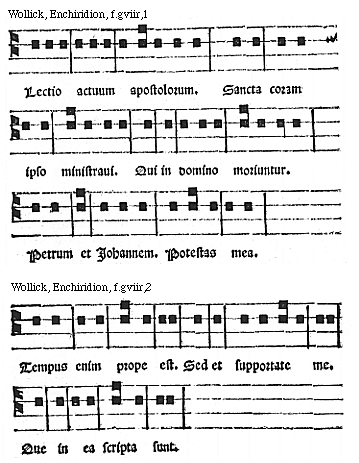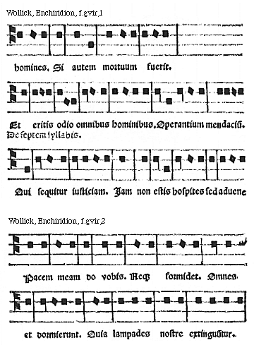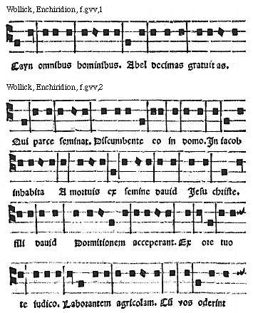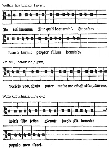 Source: Enchiridion musices Nicolai Wollici Barroducensis de gregoriana et figuratiua atque contrapuncto simplici percommode tractans, omnibus cantu oblectantibus perutile et necessarium (Impressum Parisii impensa honestissimorum virorum Iohannis Parui ad intersignium Leonis Argentei et Francisci Regnault ad intersignium diui Claudii commorantium. Anno virginei partus .1512. 14. kalendas Nouembris), ff. giv–gviir.