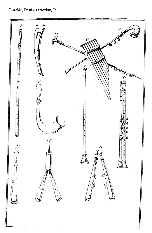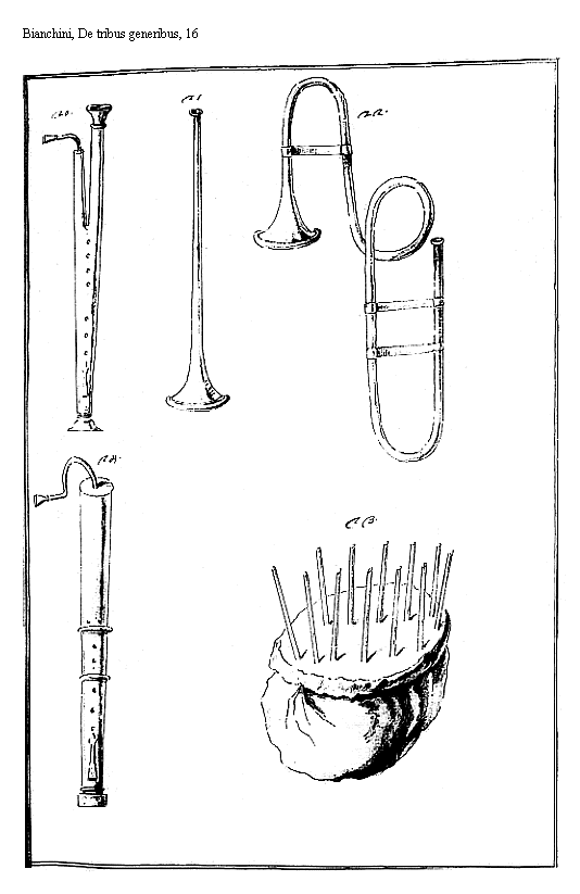 Figuram inde Sumpsimus, rati ex antiquo codice, ut Kircherus innuit, fuisse delineatam, cum Haebreorum [Halil] Halil Tibia; [Abub] Abub Fistula; et [Keren] Keren Cornu. Corneâ Buccinâ ad conuocandum coetum usos fuisse, non modo Haebreos, Sed etiam Etruscos, qui ex Phoenicibus orti pleraque illius regionis instituta in Italiam traduxerunt, et ad Latinos deriuarunt aetate Romuli, et consequentium Regum colligunt eruditi cum Bartholino de Tibiis veterum libro 3. capitulo 7. pagina 226 ex Propertio libro 4. elegia 1.