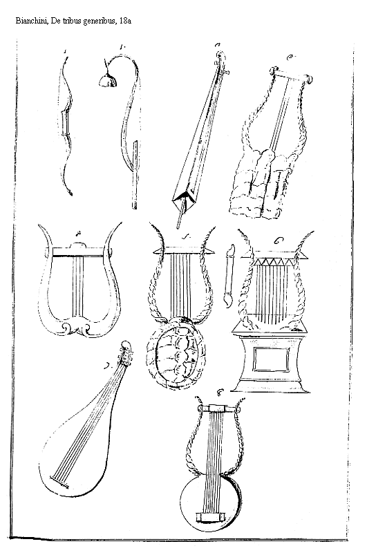 4. Tetrachordem Citharae species, quale Anacreontis est Barbyton. Lyra tetrachorda Mercurio tribuitur à Macrobio Saturnaliis libro 1. capitulo 19. Nichomachus apud Boetium libro V. Musices affirmat Mercurii Tetrachordon usque ad Orphea retentum, cui traditum à Mercurio ferunt. Lyram Phoeniciam tetrachordem fuisse narrant Auctores relati à Caelio in Caelo Astronomico Poetico in Asterismo Lyrae, et à Caelio Rhodigino loco indicato, aliisque apud Bochartum de Litteris et Sermonibus Phoenicum libro 2. capitulo 7. confirmant a Phoenicibus inuentum posteris illius Chanaan, ex quo Mercurium suum procuderunt Graeci fabulatores. Orphei Lyram tetrachordem in antiqua Pictura Coemeterii Sancti Callisti Pontificis ab Aringho editam Romae Subterraneis Tomo 1. pagina 563. Hic expressimus eodem Tomo pagina 547. Orpheus cum Lyra pentrachorda exhibetur; cum asserant Mythologi Apollinis beneficio auctum fuisse vetus Mercurii et Orphei tetrachordum ad Septem chordas. Quintam reperiuit Choroebus Lidiae regis filius. Sextam [18] addidit Hyagnis Phryx. Videatur Caesius pagina 188. Aliud Anaglyphum villae Mattheiorum reddit Poetam canentem. Lyra Pentachorda ad huius imaginem efformata.