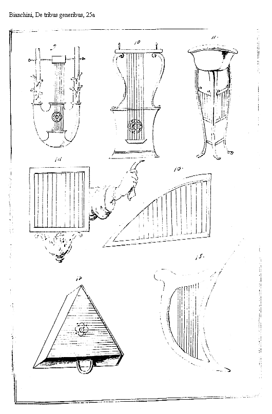 Psalterium fuisse decachordum patet Psalmo 32 in Psalterio decem chordarum psallite illi, aliisque in locis, ut illud Psalmo 91. 4 in Decachordo psalterio, quod in Haebreo legitur non ad distinguenda Organa, sed ad unum, et idem Organum describendum pertinere intelligatur. Nam citharam, quae in eodem versu memoratur, octochordam fuisse tradunt. Certè reperitur in titulis Psalmorum [Haschemminith] Haschemminith, quod nostri pro octava vertunt. Chaldaeus; eumque Sequuti gravissimi authores octochordarum citharam interpretantur, quanquam alii ad tonos magis quam ad [24] numerum chordarum referunt; Species igitur citharae habenda Sunt Organa indicata Psalterii, seu Nablii, et Cinnyrae; sunt qui Nablium à Psalterio distinguunt ex usu tantum, quod scilicet Psalterium sacris tantummodo hymnis peragendis adhiberetur; Nablium vero etiam profanis cantionibus praeter Sacros usus praesto esset. Videndus ea de re Caesius in Aterismo [recte: Asterismo] lyrae pagina 189. et sequentibis, ubi etiam Harpae nostrali, ac veteri a venantio memoratae aequiparandum putat. Caeterum Octochorda, Decachorda, et Endecachorda instrumenta ab antiquis memorata hisce figuris includimus, cum pro arbitrio musicorum plures, aut pauciores nervi eisdem aptarentur, Enneachordon etiam Orpheo tribuit Avienus pro musarum numero fortasse chordas lyrae suae aptanti, ut Coesius interpretatur loco indicato.