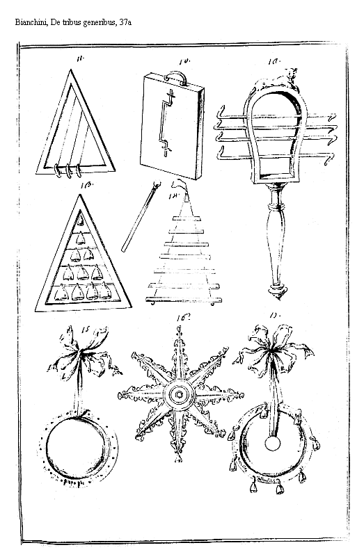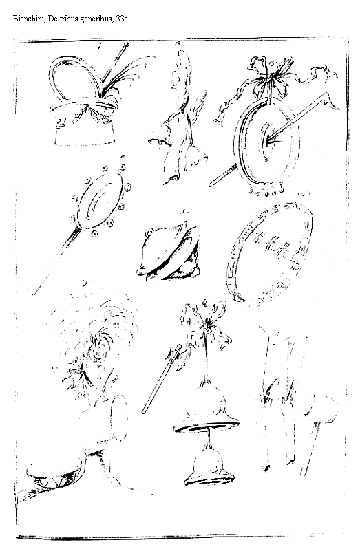 3. Tertia figura tympanorum ostendit crepitaculis instructum cum pedo pastorali eius pulsandi causa apposito. Inter antiquas picturas ita exhibetur Tabula XX à Petro Sancte Bartolo ex autographo delineatum. Cymbala crepitaculis instructa mox Subijciam.