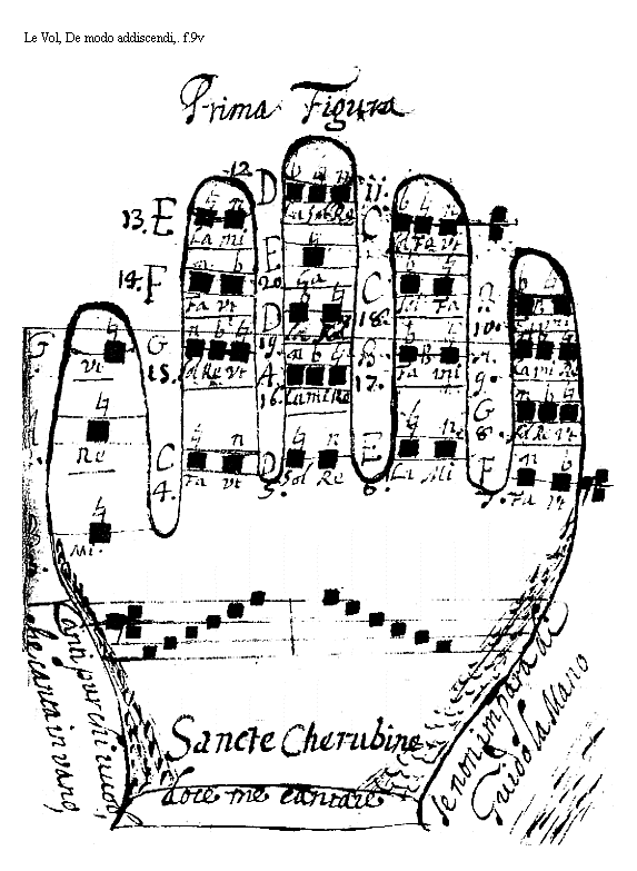 Notae, siue voces, (ut omnem prolixitatem uitemus) sunt sex scilicet; Ut, Re, Mi, Fa, Sol, La. (Quas uoces Paulus diaconus in prima strophe Hymni Sancti Ioannis Baptistae ingeniosè hoc ordine contexuit.