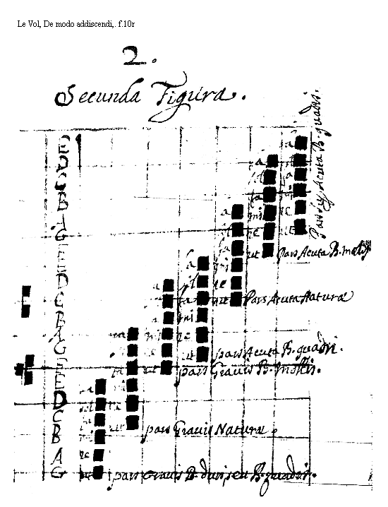 [<f.10r>] [Le Vol, De modo addiscendi, f.10r; text: Secunda Figura. [.2. add. Supra lin.] G, A, B, C, D, E, F, ut, re, mi, fa, sol, la, pars Grauis B. duri, seu B. quadri. Naturae, Mollis, Acuta, Super] [VOLDEM 02GF]