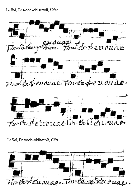 [Le Vol, De modo addiscendi, f.28v; text: Finalis, Exempli Primi. Euouae, Secundi, Tertii, Quarti, Quinti, Sexti] [VOLDEM 07GF]