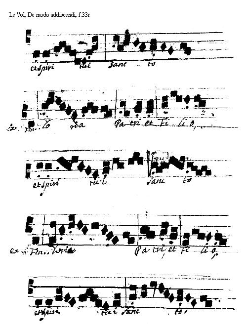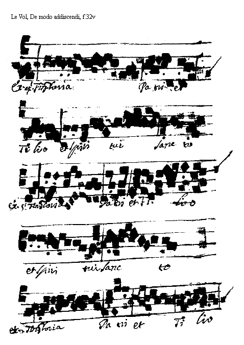 [<f.32r>] [Le Vol, De modo addiscendi, f.32r; text: Exemplum Primi Toni. Finalis. Gloria Parti et Filio et Spiritui Sancto [[Sanc]], Secundi, Tertii] [VOLDEM 08GF]