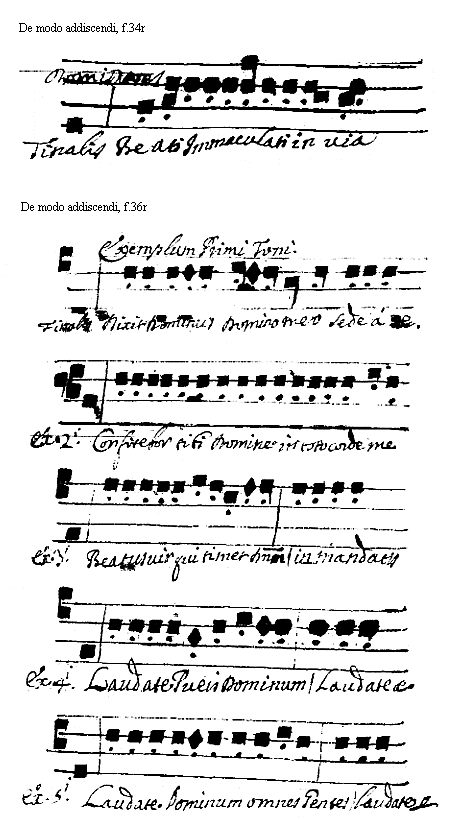 Notandum est tamen quod non est assumenda prima, nec secunda, sed dominans; hoc dico, quia in principio ponuntur aliquae notae, quae non inseruiunt ad cognoscendum Tonum Introitus, sed ad intonandum Psalmum, [et ad add. supra lin.] plus sunt tre, et aliquando sunt tamen duae; Ascendunt subinde ad dominantem. Dicitur [[autem]] [<f.34r>] autem dominans, quia est illa cum alijs in eodem loco positis, quae demonstrat, et facit Psalmum esse talis Toni: Verbi Gratia in Introitu, qui erit primi Toni, finalis erit Re, in D Sol Re, et prima cum secunda, quae indicant inchoationem seu intonationem, non Tonum; prima inquam posita est in F fa Vt, et est fa; secunda uerò est sol in G. Sol Re Vt; Sed ut cognosciutur qualis sit Tonus, non oportet assumere primam, nec secundam, sed tertiam quae est La distans per Diapente à finali Introitus, et ponitur in A la mi Re, et similes ipsi, quae sequuntur usque ad medium uersus, hanc dico oportet respicere ad cognoscendum Tonum Introitus, quod clarius apparebit hoc exemplo.