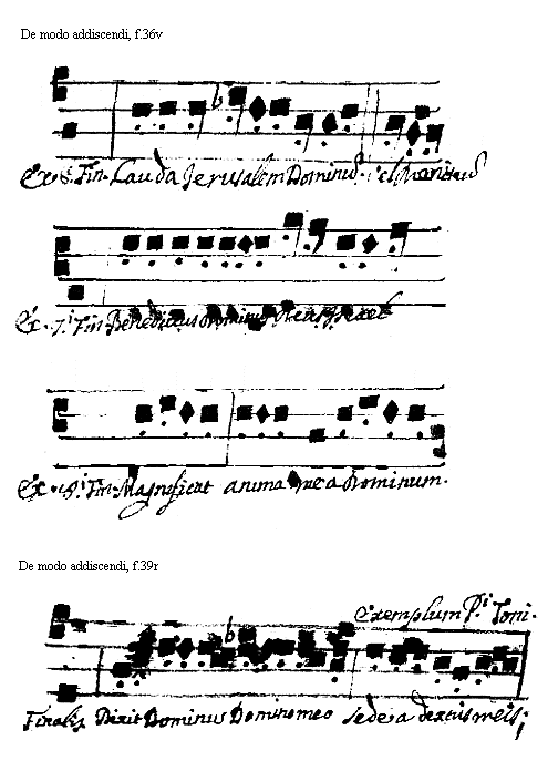 [<f.36v>] [Le Vol, De modo addiscendi, f.36v; text: Exemplum Sexti, Finalis, Lauda Ierusalem Dominum, vel, Septimi, Benedictus Dominus Deus Israel, Octaui Magnificat anima mea Dominum.] [VOLDEM 12GF]