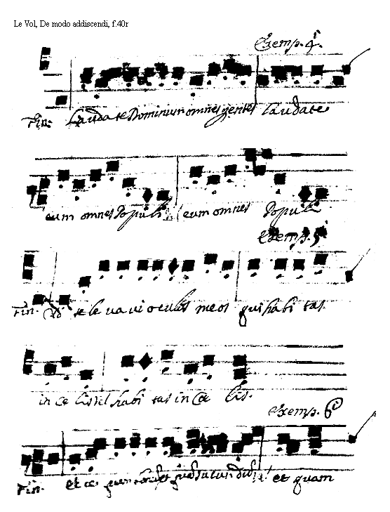 [<f.40r>] [Le Vol, De modo addiscendi, f.40r; text: Exemplum Quarti. Finalis. Dominum omnes gentes eum omnes Populi, Quinti. Ad te leuaui oculos meos qui habitas in caelis. Sexti. Ecce quam bonum, et quam iucundum] [VOLDEM 14GF]