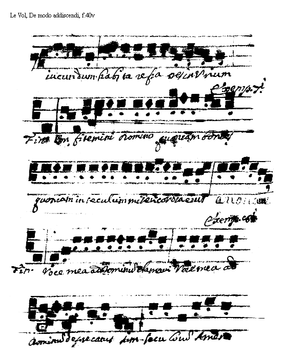 [<f.40v>] [Le Vol, De modo addiscendi , f.40v; text: iucundum habitare Vnum. Septimi. Finalis. Confitemini Domino quoniam bonus in seculum misericordia eius, Exemplum Octaui. Voce mea ad Dominum clamaui, deprecatus sum. Seculorum amen.] [VOLDEM 15GF]