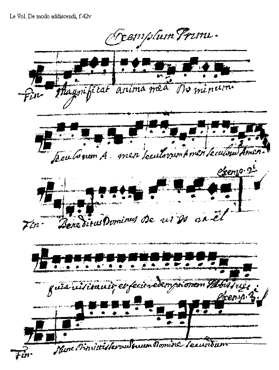[<f.42v>] [Le Vol, De modo addiscendi, f.42v; text: Exemplum Primi. Finalis. Magnificat anima mea Dominum. Saeculorum Amen. Secundi. Benedictus Dominus Deus Israel quia uisitauit, et fecit redemptionem Plebis suae. Tertii. Nunc Dimittis seruum tuum Domine secundum] [VOLDEM 16GF]