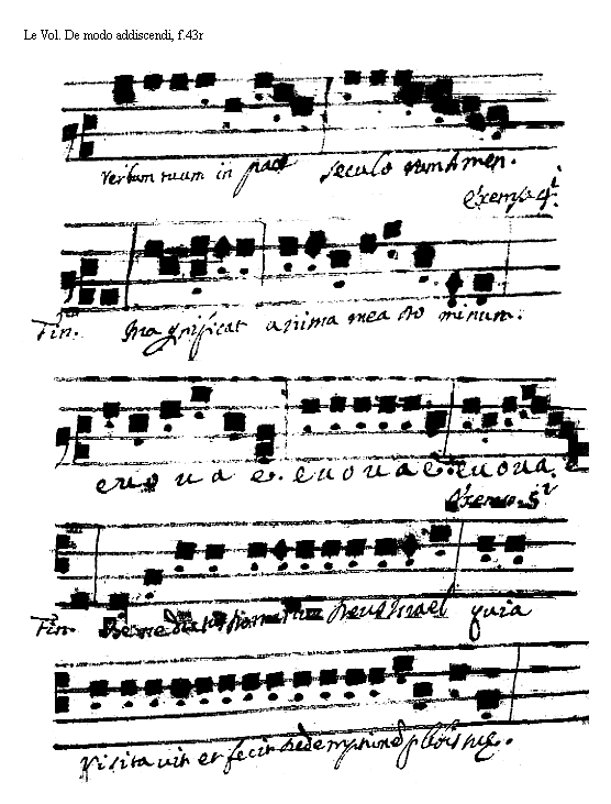 [<f.43r>] [Le Vol, De modo addiscendi, f.43r; text: verbum tuum in pace seculorum Amen. Exemplum Quarti. Finalis. Magnificat anima mea Dominum. euouae. Quinti. Benedictus Dominus Deus Israel quia uisitauit, et fecit redemptionem Plebis suae.] [VOLDEM 17GF]
