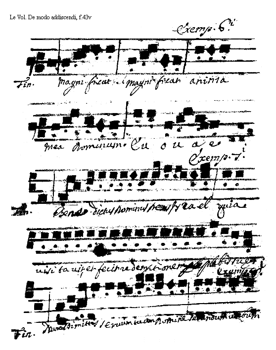 [<f.43v>] [Le Vol, De modo addiscendi, f.43v; text: Exemplum Sexti. Magnificat anima mea Dominum. euouae. Septimi. Benedictus Dominus Deus Israel quia uisitauit, et fecit redemptionem Plebis suae. Finalis. Octaui. Nunc Dimittis seruum tuum Domine secundum uerbum] [VOLDEM 18GF]
