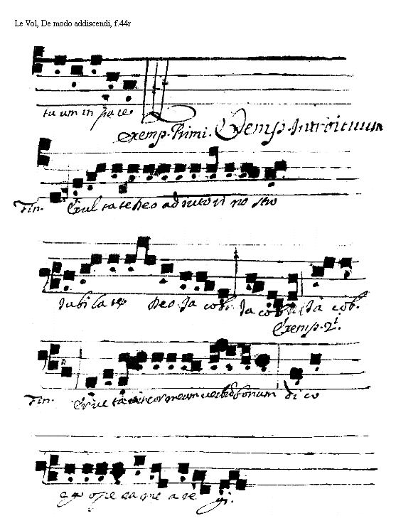 [<f.44r>] [Le Vol, De modo addiscendi, f.44r; text: Exemplum Primi. Finalis. Exempla Introituum, Exultate Deo adiutori nostro, Iubilate Deo Jacobi, Secundi. Eructauit cor meum uerbum bonum dico ego opera mea regi.] [VOLDEM 19GF]