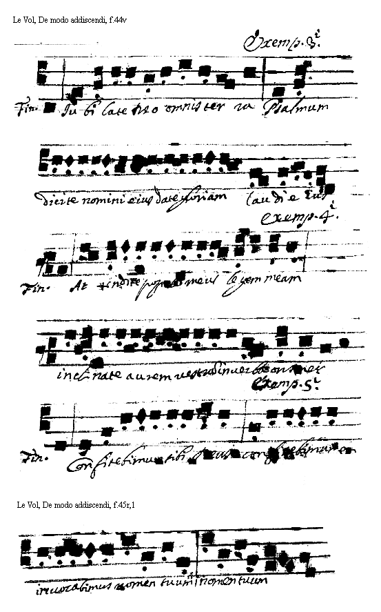 [<f.44v>] [Le Vol, De modo addiscendi, f.44v; text: Exemplum Tertii. Finalis. Iubilate omnis terra Psalmum dicite nomini eius date gloriam laudi eius. Quarti. Attendite popule meus legem meam inclinate aurem uestrum in uerba oris mei Quinti. Confitebimur tibi Deus et] [VOLDEM 20GF]