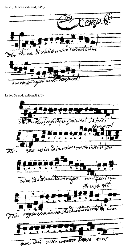 [<f.45v>] [Le Vol, De modo addiscendi, f.45v; text: Finalis. Gloria Patri, et filio, et Spiritui Sancto, Exempla Septimi. Deus in adiutorium meum intende Domine ad adiuuandum me festina, Octaui. Magnus Dominus et laudabilis nimis in ciuitate Dei nostri in monte Sancto eius] [VOLDEM 21GF]