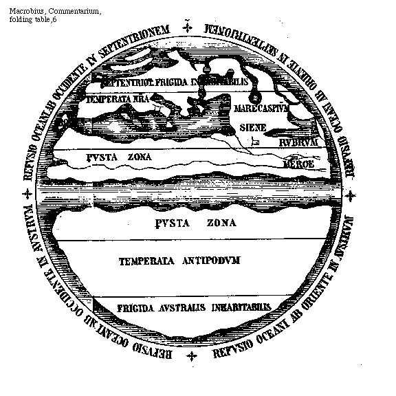 [Macrobius, Commentarium, folding table,6; text: Refusio oceani ab occidente in septentrionem, Refusio oceani ab occidente in austrum, Refusio oceani ab oriente in austrum, Refusio oceani ab oriente in septentrionem, Septentrionalis frigida inhabitabilis, Orcades, Temperata nostra, Mare Caspium, Siene, Rubrum, Meroe, Perusta zona, Temperata antipodum, Frigida australis inhabitabilis] [MACCOM2 02GF]
