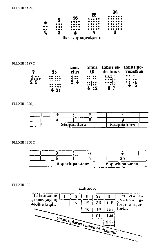 [PLLXIII:1202; text: Latitudo, Quadrupli in latitudine. 1, 4, 16, 64, 236, 5, 20, 80, 320, 25, 100, 400, 125, 500, 625, Sesquiquarti superni ad inferos proximos. Quincupli omnes diagonii] [BOEDIM2 03GF]