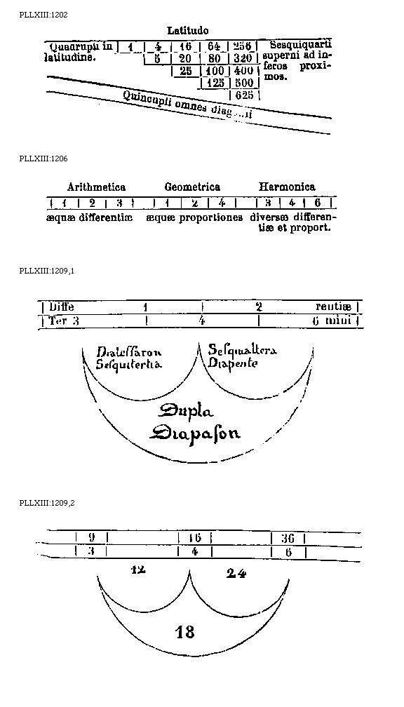[PLLXIII:1206; text: Arithmetica, Geometrica, Harmonica, 1, 2, 3, 4, 6, aequae differentiae, aequae proportiones, diversae differentiae et proportiones] [BOEDIM2 03GF]