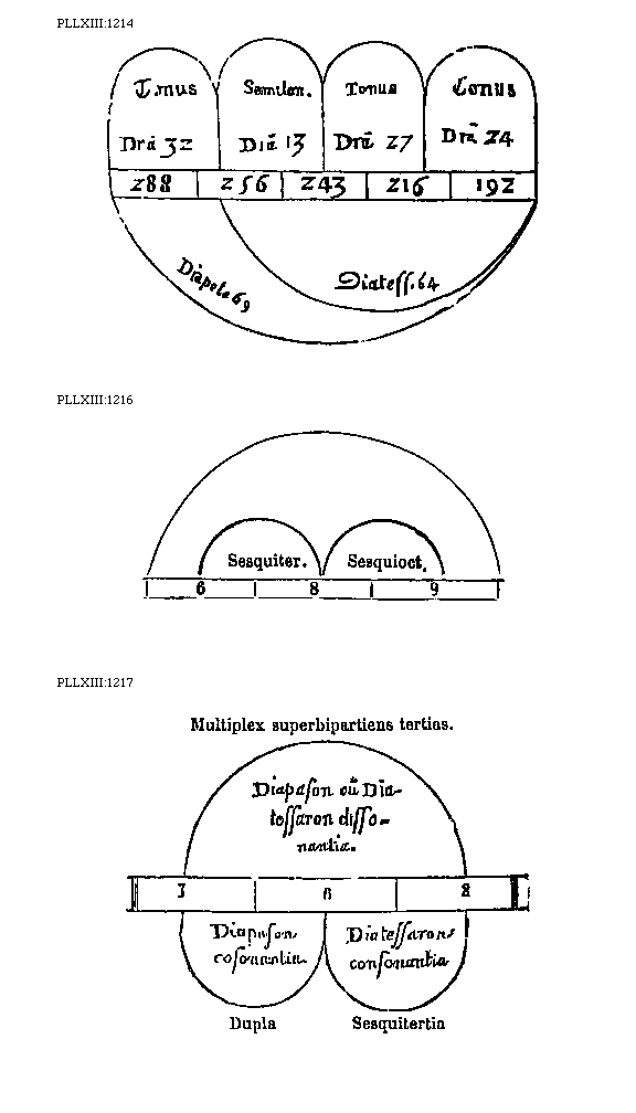 Sunt igitur diatessaron consonantiam resonantes 24 ad 18, et 12 ad 9, diapente vero 18 ad 12, et 24 ad 16, et 36 ad 24. Tripla autem quae est diapason et diapente 36 ad 12. Quadrupla vero quae est bis diapason 36 ad 9. Epogdous vero qui tonus est 18 ad 16 comparatione servatur.