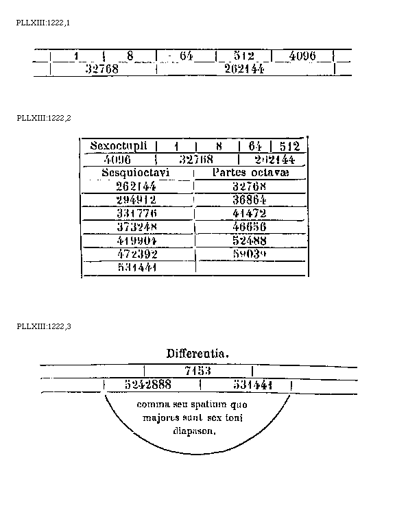 [PLLXIII:1222,3; text: Differentia. 7153, 5242888, 531441, comma seu spatium quo majores sunt sex toni diapason.] [BOEDIM2 08GF]