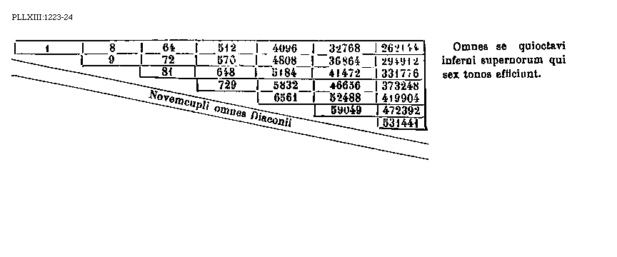 [1223-24] [PLLXIII:1223-24; text: 1, 8, 64, 512, 4096, 32768, 262144, 9, 72, 576, 4808, 36864, 294912, 81, 648, 5184, 41472, 331776, 729, 5832, 46656, 373248, 6561, 52488, 419904, 59049, 472392, 531441, Omnes se quioctavi inferni supernorum qui sex tonos efficiunt. Novemcupli omnes Diaconii] [BOEDIM2 09GF]