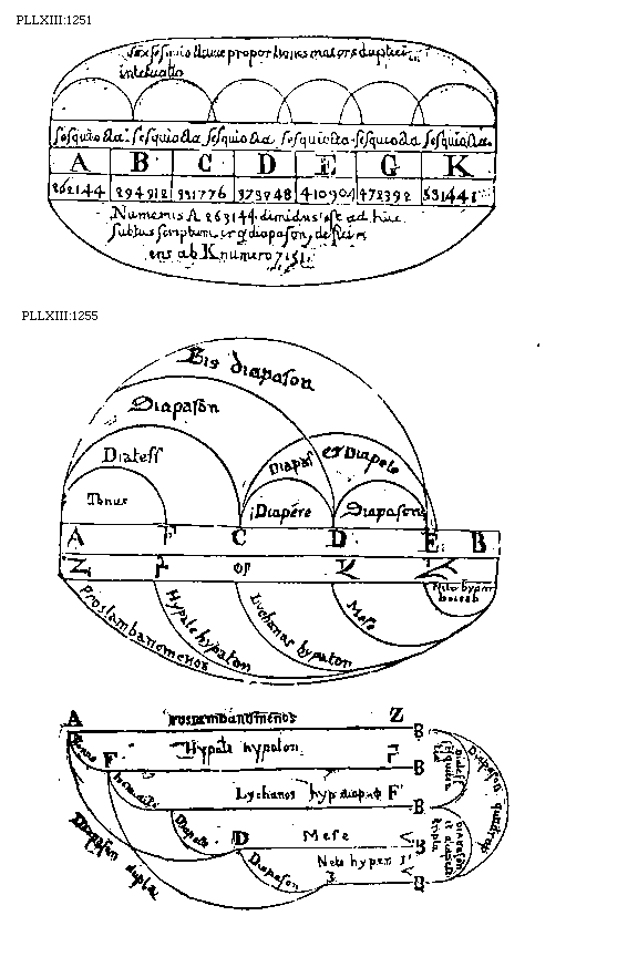 [1255] [PLLXIII:1255; text: Bis diapason, Diapason, Diatessaron, Diapason et Diapete, Tonus, Diapente, A, F, C, D, E, B, Proslambanomenos, Hypate hypaton, Lvehanos hypaton, Mese, Nete hypmboieon, Z, Lychanos hypaton diapason [Phi], Diapason dupla, 3, B, Diapason quadruplus, Diatessaron sesquitertia, Diapason et diapente tripla, Nete hyperboleon] [BOEDIM4 05GF]