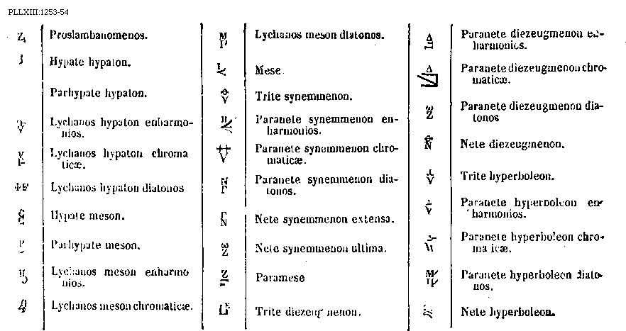 [1253-54] [PLLXIII:1253-54; text: Proslambanomenos. Hypate hypaton. Parhypate hypaton. Lychanos hypaton enharmonios. Lychanos hypaton chromaticae. Lychanos hypaton diatonos. Hypate meson. Parhypate meson. Lychanos meson enharmonios. Lychanos meson chromaticae. Lychanos meson diatonos. Mese. Trite synemmenon. Paranete synemmenon enharmonios. Paranete synemmenon chromaticae. Paranete synemmenon diatonos. Nete synemmenon extensa. Nete synemmenon ultima. Paramese, Trite diezeugmenon. Paranete diezeugmenon enharmonios. Paranete diezeugmenon chromaticae. Paranete diezeugmenon diatonos. Nete diezeugmenon. Trite hyperboleon. Paranete hyperboleon enharmonios. Paranete hyperboleon chroma icae. Paranete hyperboleon diatonos. Nete hyperboleon.] [BOEDIM4 06GF]