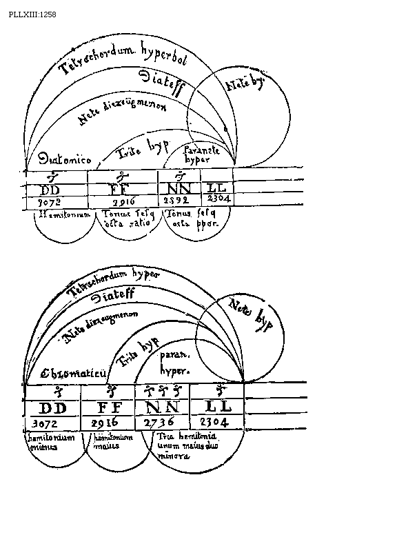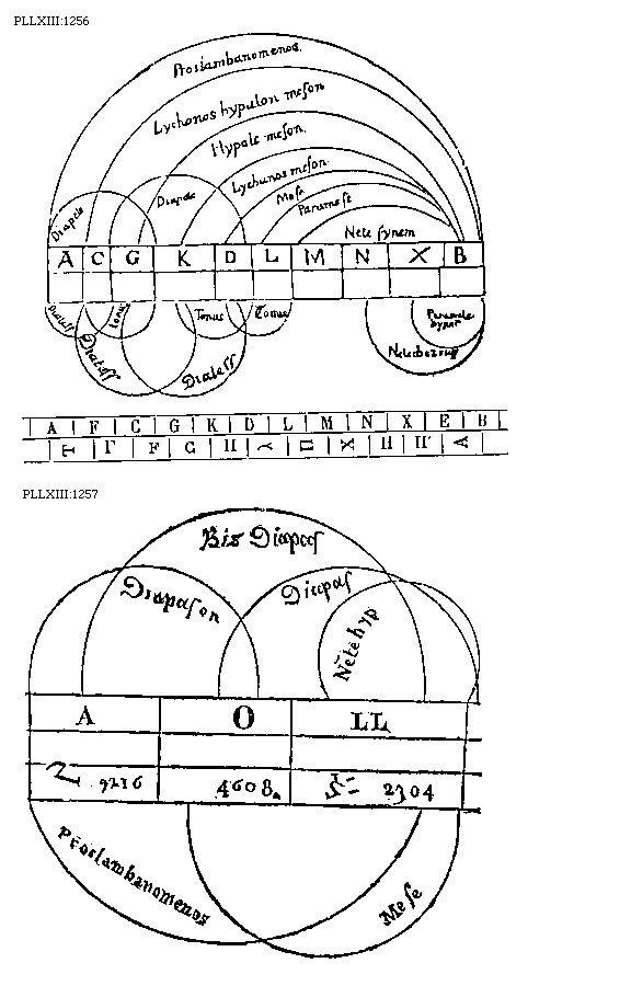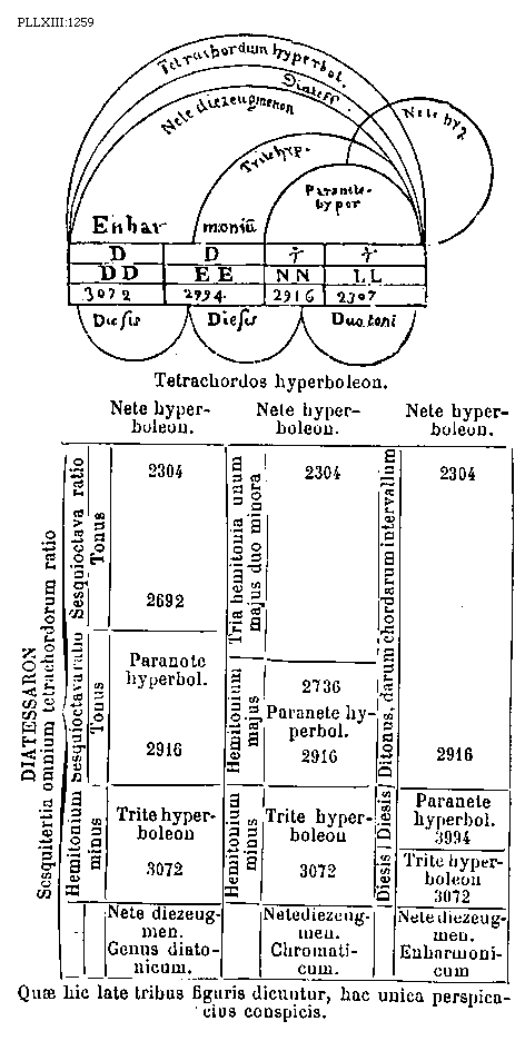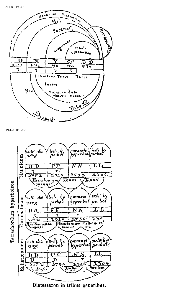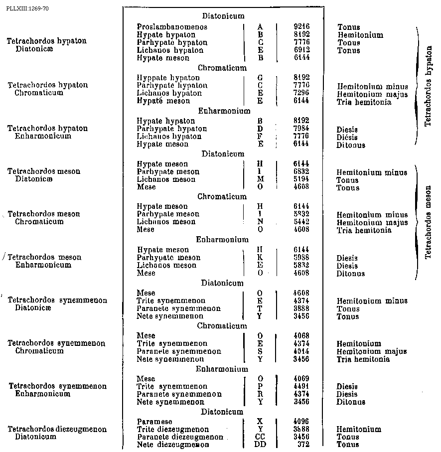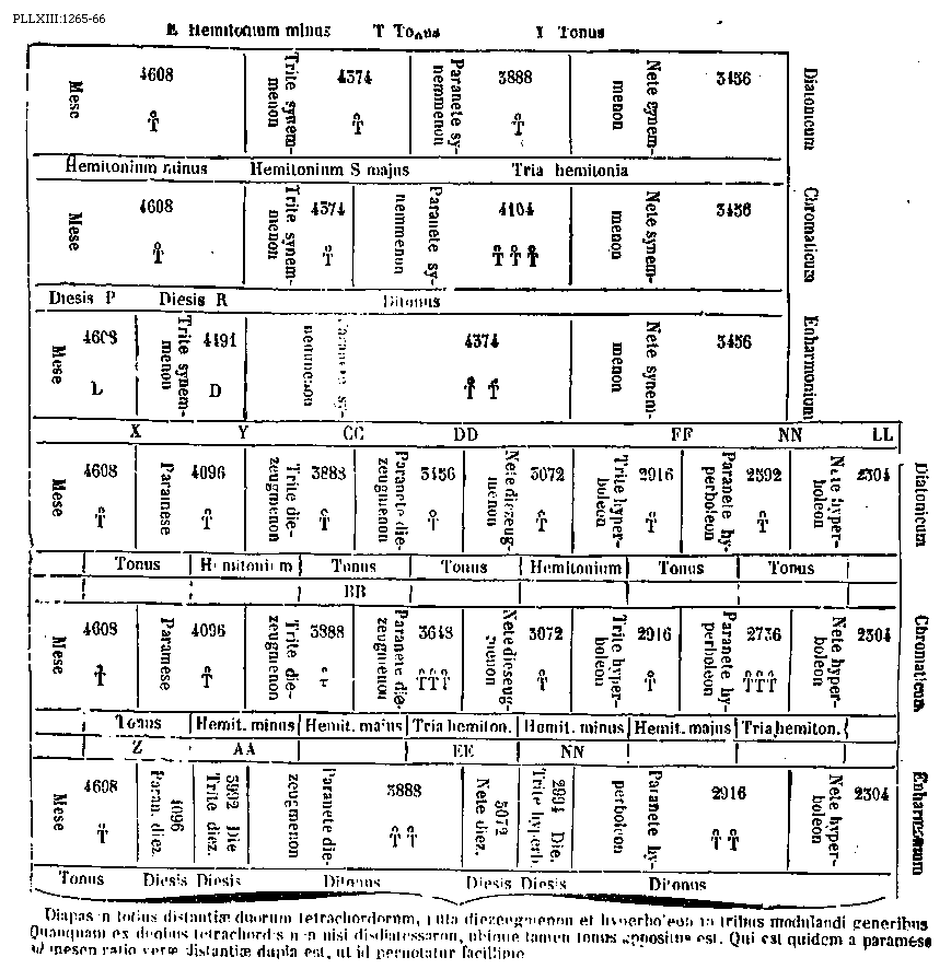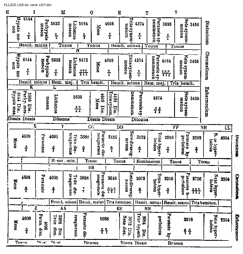 [PLLXIII:1269-70; text: Tetrachordos hypaton Diatonicae, Tetrachordos hypaton Chromaticum, Tetrachordos hypaton Enharmonicum, Tetrachordos meson Diatonicae, Tetrachordos meson Chromaticum, Tetrachordos meson Enharmonicum, Tetrachordos synemmenon Diatonicae, Tetrachordos synemmenon Chromaticum, Tetrachordos synemmenon Enharmonicum, Tetrachordos diezeugmenon Diatonicum, Diatonicum, Chromaticum, Enharmonium, Proslambanomenos, Hypate hypaton, Parhypate hypaton, Lichanos hypaton, Hyppate hypaton, Hypate meson, Parhypate meson, Lichanos meson, Mese, Trite synemmenon, Paranete synemmenon, Nete synemmenon, Paramese, Trite diezeugmenon, Paranete diezeugmenon, Nete diezeugmenon, A, B, C, D, E, F, G, H, I, K, M, N, O, P, R, S, X, Y, Z, CC, DD, Diesis, Hemitonium minus, Hemitonium majus, Tonus, Tria hemitonia, Ditonus, 9216, 8192, 7984, 7776, 7296, 6912, 6832, 6144, 5988, 5832, 5442, 5194, 4608, 4491, 4374, 4096, 4069, 4068, 4014, 3888, 3456, 372] [BOEDIM4 14GF]