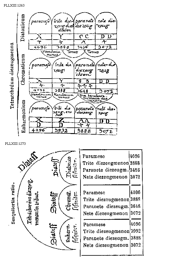 [1263] [PLLXIII:1263; text: Tetrachrdum diezeugmenon, Enharmonium, Chromaticum, Diatonicum, paramese, trite diezeugmenon diat diaton, paranete diezeugmenon, nete diezeugmenon, X, Y, CC, DD, Z, AA, BB, D, 4096, 3808, 3456, 3072, Hemitonium minus, Tonus, trite diezeugmenon, paranete diezeugmenon chromaticum, nete = diezeugmenon, 3888, 3648, Tria hemitoncanu maius duo minora, trite diezeugmenon enharmonium, 3992] [BOEDIM4 11GF]
