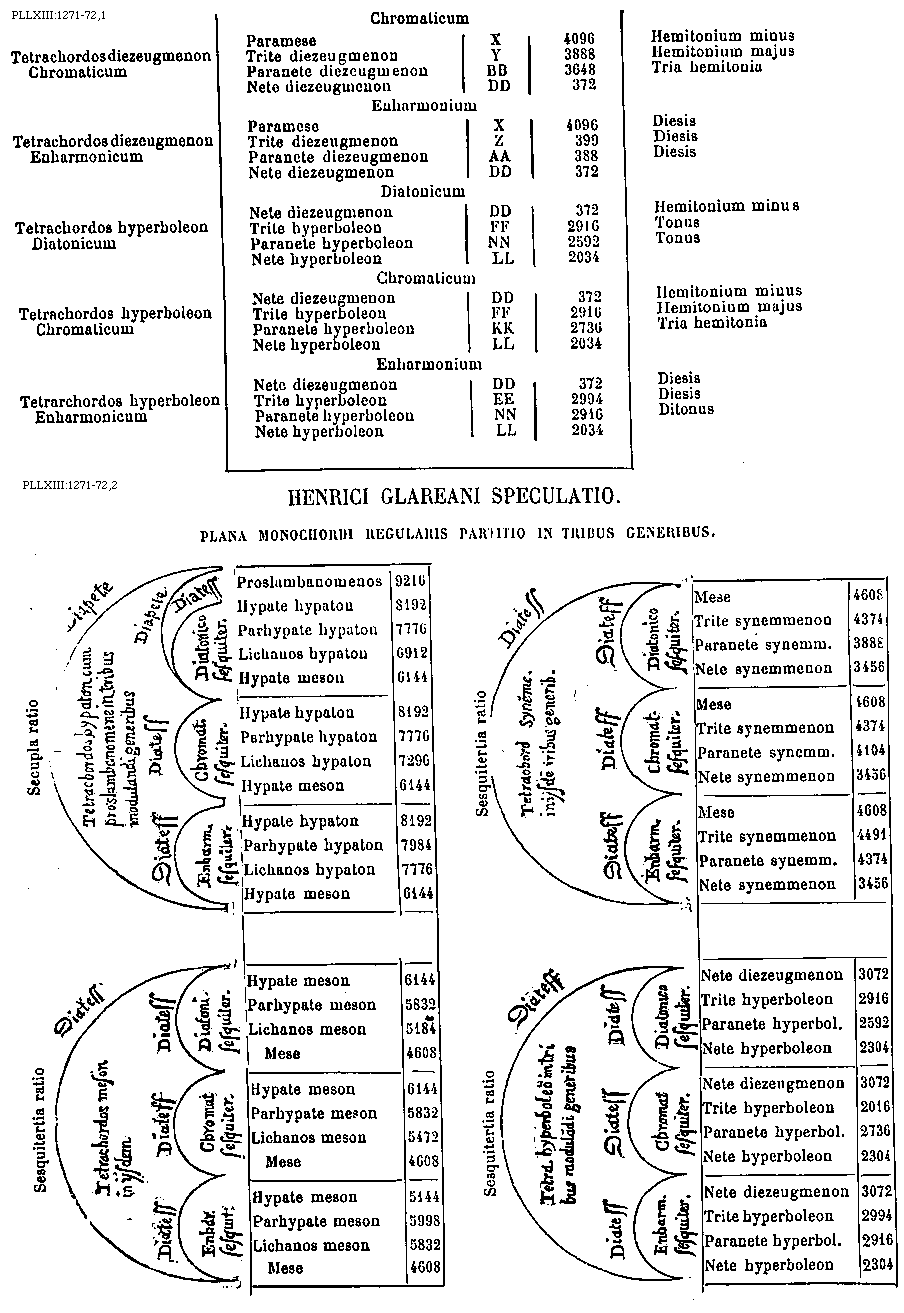 [PLLXIII:1271-72,2; text: Henrici Glareani speculatio. Plana monochordi regularis partitio in tribus generibus. Proslambanomenos, Hypate hypaton, Parhypate hypaton, Lichanos hypaton, Hypate meson, Parhypate meson, Lichanos meson, Mese, Trite synemmenon, Paranete synemmenon, Nete synemmenon, Nete diezeugmenon, Trite hyperboleon, Paranete hyperboleon, Nete hyperboleon, Secupla ratio, Sesquitertia ratio, Diapente, Diatessaron, Tetrachordos bypaton cum proslambanomene in tribus modulandi generibus, Tetrachordos meson in ijsdem, Tetrachordos hyperboleon in tribus modulandi generibus, Tetrachord syemmenon in ijsdem iribus generibus, Diatonico, Enharmonico, Chromatico, sesquitertia, 9216, 8192, 7984, 7776, 6912, 6144, 5998, 5832, 5472, 5184, 5144, 4608, 4491, 4374, 4104, 3888, 3456, 3072, 2994, 2916, 2736, 2592, 2304] [BOEDIM4 15GF]