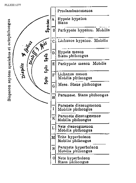 [PLLXIII:1277; text: Diapason septem speciebus et octophthongus, Diapente 4 speciebus, Diatessaron 3 species, Species, Proslambanomenos, A, Hypate hypaton, Stans, B, Parhypate hypaton. Mobilis, C, Lichanos hypaton. D, Hypate meson, Stans phthongus, E, Parhypate meson, F, Lichanos meson, Mobilis phthongus, G, Mese. H, Paramese. I, Paranete diezeugmenon, K, L, Nete diezeugmenon, M, Trite hyperboleon, N, Paranete hyperboleon, O, Nete hyperboleon] [BOEDIM4 16GF]