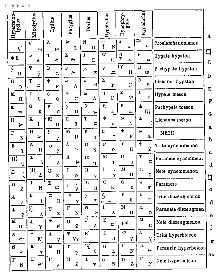 [1279-80] [PLLXIII:1279-80; text: Hypermixolydius, Mixolydius, Lydius, Phrygius, Dorius, Hypolydius, Hypophrygius, Hypodorlus, Proslambanomenos, Hypate hypaton, Parhypate hypaton, Lichanos hypaton, Hypate meson, Parhypate meson, Lichanos meson, [MESE], Trite synemmenon, Paranete synemmenon, Nete synemmenon, Paramese, Trite diezeugmenon, Paranete diezeugmenon, Nete diezeugmenon, Trite hyperboleon, Paranete hyperboleon, Nete hyperboleon, A, [sqb], C, D, E, F, G, a, b, c, d, e, f, g, Aa] [BOEDIM4 17GF]