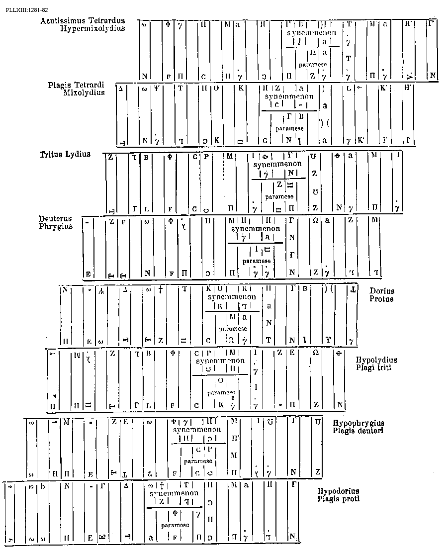 [1281-82] [PLLXIII:1281-82; text: Acutissimus Tetrardus Hypermixolydius, Plagis Tetrardi Mixolydius, Tritus Lydius, Deuterus Phrygius, synemmenon, paramese, Dorius Protus, Hypolydius Plagi triti, Hypophrygius Plagis deuteri, Hypodorius Plagis proti] [BOEDIM4 18GF]