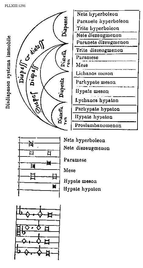 [1291] [PLLXIII:1291; text: Disdiapason systema immobile, Diapason et diatessaron, Diapason, Diatessaron, Diapente, Nete hyperboleon, Paranete hyperboleon, Trite hyperboleon, Nete diezeugmenon, Paranete dizeugmenon, Trite diezeugmenon, Paramese, Mese, Lichanos meson, Parhypate meson, Hypate meson, Lychanos hypaton, Parhypate hypaton, Hypate hypaton, Proslambanomenon] [BOEDIM5 02GF]