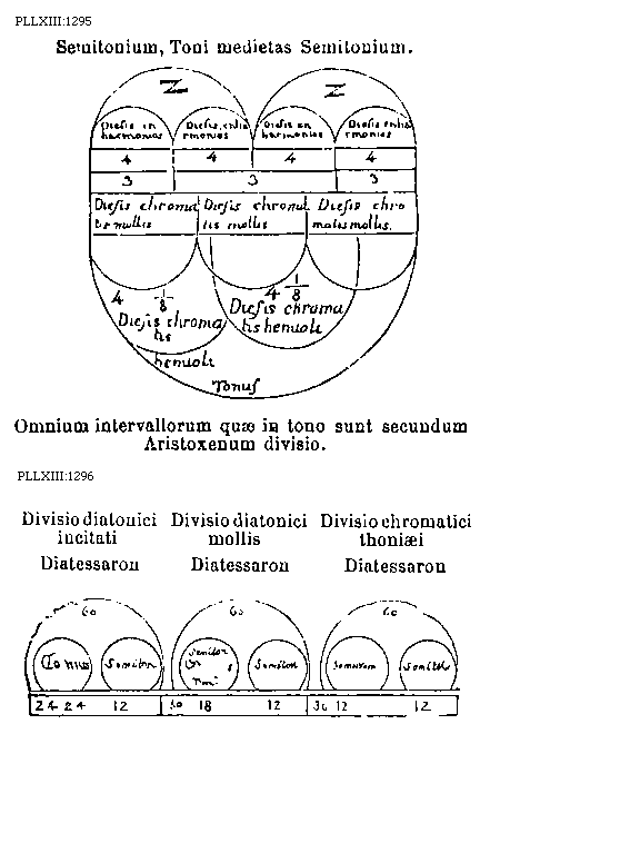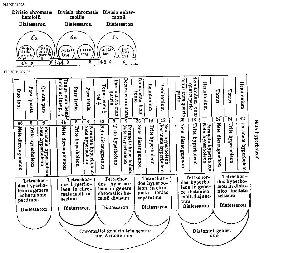 [PLLXIII:1297-98; text: Hemitonium, 12, Paranete hyperboleon, Tonus, 24, Trite hyperboleon, Nete diezeugmenon, Paranete hyperboleon, Nete hyperboleon, Hemitonium cum quarta parte, 18, Trite hyperboleon, Tonus cum quarta parte, 30, Nete diezeugmenon, Tonus cum hemitonio, 36, Octava cum quarta, 9, Pars octava cum quarta, Tonus cum 6/8 vel 3/4, 42, Pars tertia, 8, Tonus cum hemitonio et insuper 3/4, 44, Quatra pars, 6, Pars quarta, Duo toni, 48, Tetrachordos hyperboleon in genere enharmonio partitum. Tetrachordos hyperboleon in chromate molli disectum, Tetrachordos hyperboleon in genere chromatici hemioli divisum, Tetrachordos hyperboleon in chromate tonico separatum, Tetrachordos hyperboleon in genere diatonico molli disjunctum, Tetrachordos hyperboleon in diatonico incitato scissum, Chromatici generis tria secundum Aritoxenum, Diatonici generi duo] [BOEDIM5 04GF]