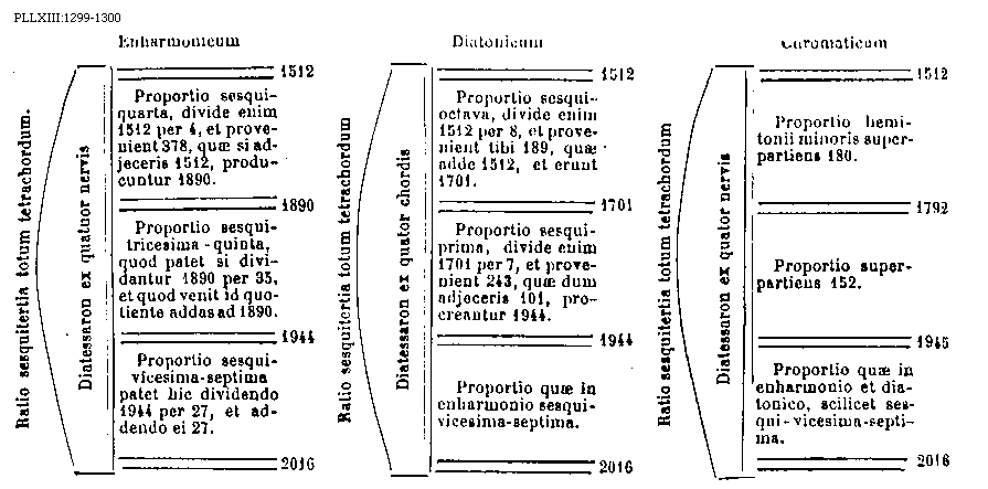 [1299] [PLLXIII:1299-1300; text: Enharmonicum, Ratio sesquitertia totum tetrachordum. Diatessaron ex quatuor nervis, Proportio sesquiquarta, divide enim 1512 per 4, et provenient 378, quae si adjeceris 1512, producuntur 1890. Proportio sesquitricesima-quinta, quod patet si dividantur 1890 per 35, et quod venit id quotiente addas ad 1890. Proportio sesquivicesima-septima patet hic dividendo 1944 per 27, et addendo ei 27. 2016, Diatonicum, Diatessaron ex quatuor chordis, Proportio sesquioctava, divide enim 1512 per 8, et provenient tibi 189, quae adde 1512, et erunt 1701. Proportio sesquiprima, divide enim 1701 per 7, et provenient 243, quae dum adjeceris 101, procreantur 1944. Proportio quae in enharmonio sesquivicesima-septima. Chromaticum, Proportio hemitonii minoris superpartiens 180. Proportio superpartiens 152. Proportio quae in enharmonio et diatonico, scilicet sesqui-vicesima-septima. 1792, 1945] [BOEDIM5 05GF]