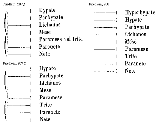 [Friedlein, 208; text: Hyperhypate, Hypate, Parhypate, Lichanos, Mese, Par